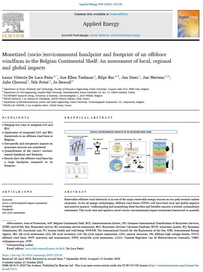 - De Luca Peña, L.V.; Taelman, S.E.; Staes, J.; Bas, B.; Préat, N.; Dewulf, J. (2023). How sustainable are offshore windfarms? An assessment to quantify local to global (socio-) environmental impacts of a case study in the Belgian Continental Shelf, in: Mees, J. et al. Book of abstracts – VLIZ Marine Science Day, 1 March 2023, Bruges. VLIZ Special Publication, 90: pp. 22 (link)